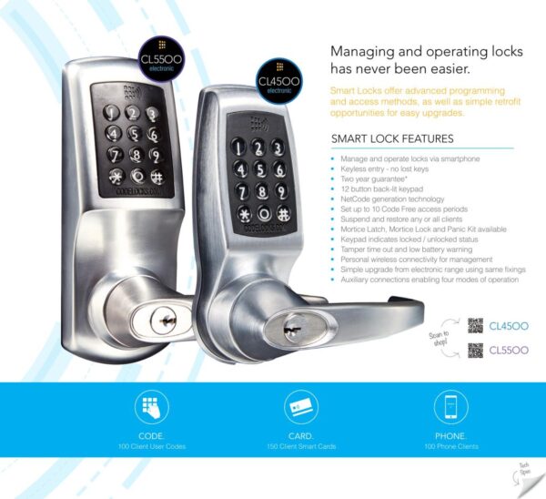 Managing and operating locks has never been easier. The CL5510 Smart Mortice Lock offers advanced programming and access methods, as well as simple retrofit opportunities for easy upgrades from the CL5000 range. Fire rated lock supplied with Codelocks FireKit.